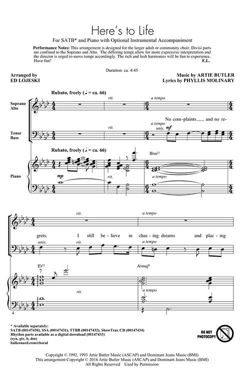 Your pianist takes an equal role in this exquisite ballad that is tinged with melancholy. A superb selection for a more mature or community ensemble. Here's to life, here's to love and here's to you.