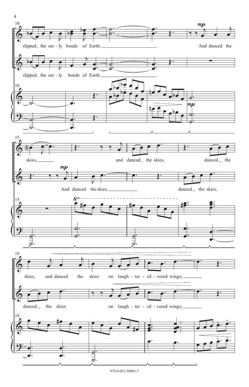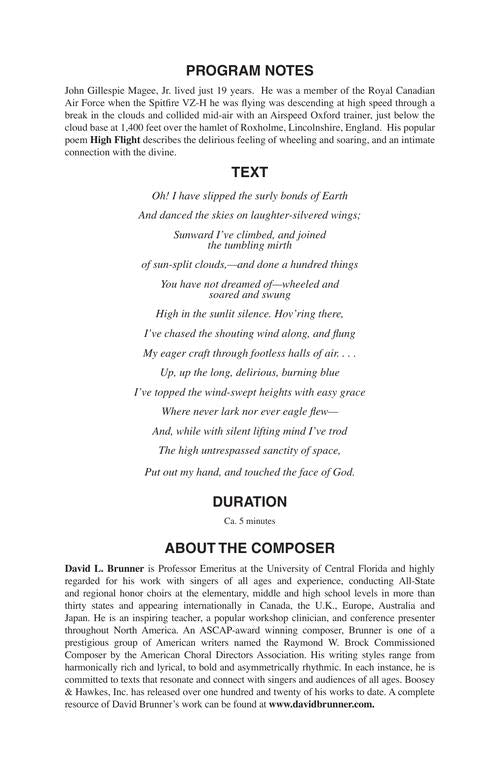 Now available for treble voices. Royal Canadian Air Force Pilot John Magee wrote his popular poem High Flight when he was just 19 years old. In the poem, he describes the delirious feeling of wheeling and soaring, and an intimate connection with the divine. Setting these words, the composer's music soars and dives and floats and reflects the joy this young pilot experienced from the pilot's chair.