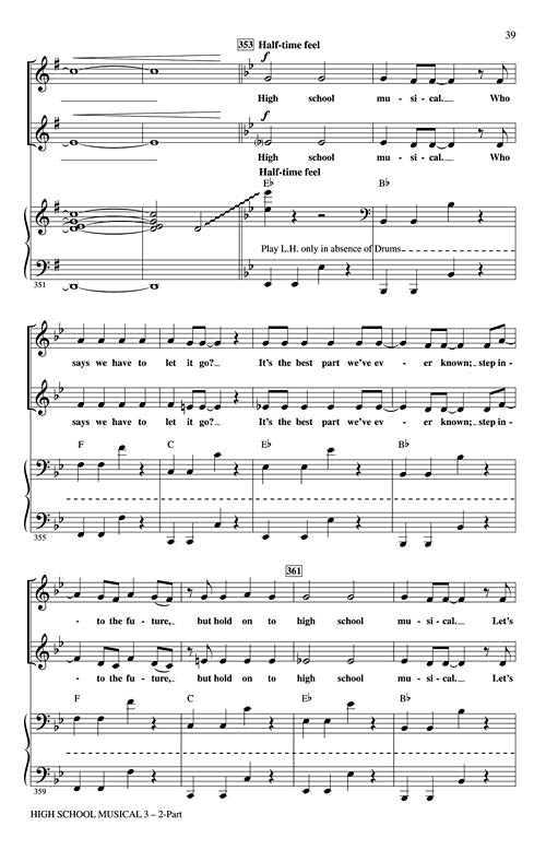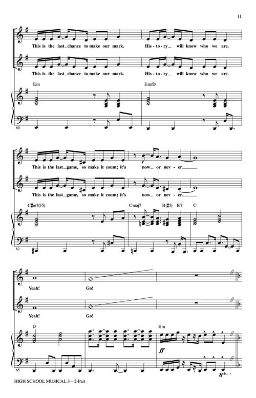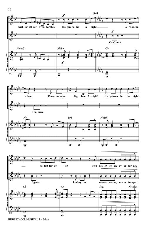 The Wildcats are back in High School Musical 3, facing senior year and their impending graduation. Join the fun, the romance and most of all the music as Troy and Gabriella and the HSM3 gang rock the house in this 12-minute panorama featuring songs from the movie soundtrack. Includes: We're All in This Together (Graduation Version), Now or Never, Right Here Right Now, A Night to Remember, I Want It All, Can I Have This Dance, High School Musical. Available separately: SATB, SAB, 2-Part, ShowTrax CD. Duration: ca. 11:30.
