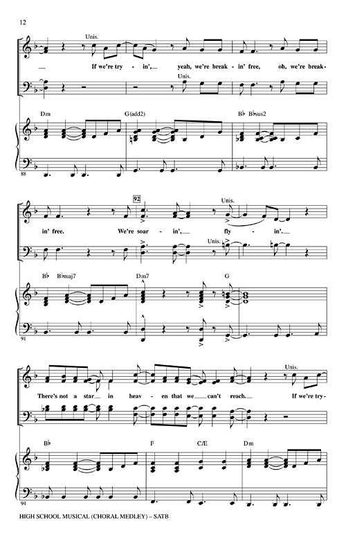 As the highest rated television movie in the history of Disney, this feel-good story has struck a chord with young people across the country. Bring the magic into your school with this fun to sing 10-minute medley that includes: Bop to the Top, Breaking Free, Get'cha Head in the Game, Start of Something New, We're All in This Together, What I've Been Looking For.Available separately: SATB, 3-Part Mixed, 2-Part and ShowTrax CD. Performance Time: Approx. 9:30