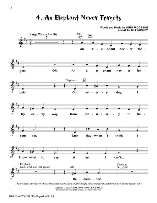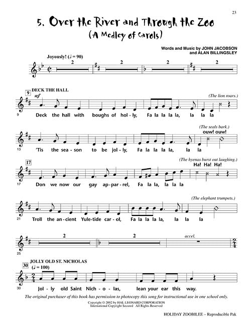 Over the river and through the zoo ... a holiday treat for me and you! Join the laughing hyenas, swingin' monkeys, an elephant that (usually) never forgets and a host of other animals as they prepare for the holiday season. But why is Mr. Zookeeper so sad? Celebrate the true spirit of the holiday season as the zoo animals discover how to make their special friend smile again. This entertaining and easy-to-prepare 15-minute musical for primary grades will delight audiences of all ages with five original songs, clever rhyming dialog, choreography and staging tips ... all included right in the Teacher Edition. The Reproducible Pak provides the vocal lines, lyric sheets and dialog and the professionally orchestrated ShowTrax CD will provide that perfect final touch! For a real budget-saver, choose the Classroom Kit for all three components. Songs include: Holiday Zoobilee, Jingle Bell Swing, Together, An Elephant Never Forgets, Over the River and Through the Zoo.