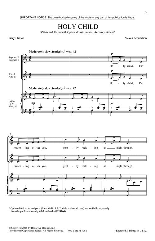 Written for the famous St. Olaf Christmas Concert in 2002, this is a lullaby for the Christ child sung by his mother Mary at the manger. Mary gently rocks the baby Jesus to sleep while singing of this blessed night and this wondrous sight. Accompanied by piano this is a beautiful addition to any Christmas/winter concert. When the optional string orchestra is employed this is the centerpiece of your program.