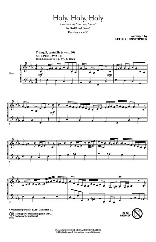 What better combination than a traditional hymn in a Baroque setting? Bach's Sleepers, Awake from Cantata No. 140 in the background will be familiar, allowing you to present a new and comfortable rendition of the beloved Holy, Holy, Holy. A ChoirTrax and Instrumental Pak (strings) provide optional rehearsal and/or performance options. Available separately: SATB, ChoirTrax CD. Score and Parts for Strings available digitally (80042). Duration: ca: 4:30.