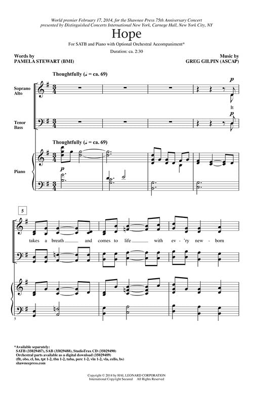 Premiered at the Shawnee Press 75th Anniversary Concert at Carnegie Hall, February 17th, 2014, this powerful and inspirational work sings of hope described through the phases of life, such as a newborn's cry, the laughter of children, the ashes of the fire of love that has died, the quiet comfort of a dream. Set to haunting and dynamic music with piano or optional orchestration, the gorgeous work comes to a moving conclusion of: Hope is not lost; hope is not gone. It is not dead; it still lives on. Hope will arise!