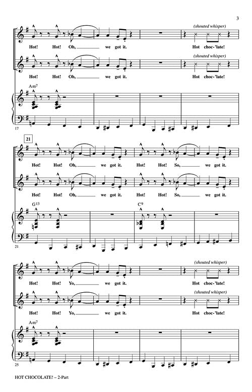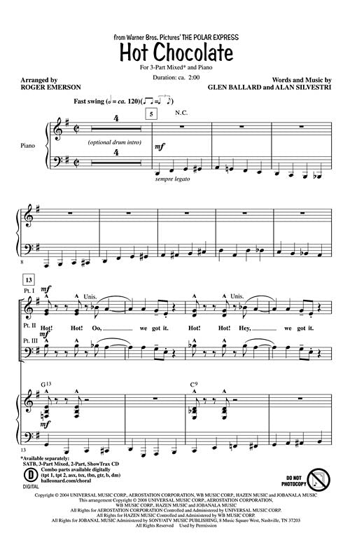 You'll have a wild ride indeed with this big band style swing number from the blockbuster Christmas film The Polar Express. Sung by the on-board waiters who are serving hot chocolate to the delighted riders, this tune is hot, hot, hot! Duration: ca. 2:00. Available separately: SATB, 3-Part Mixed, 2-Part, ShowTrax CD, ePak available digitally (tpt1, tpt2, asx, tsx, tbn, gtr, b, dm)