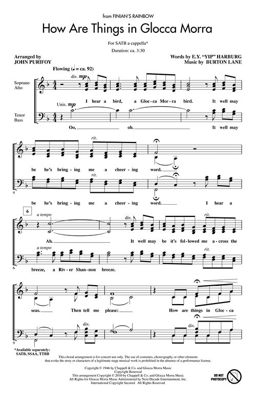 From Finian's Rainbow, revived on Broadway in 2009, comes one of the score's most famous numbers, here in an expressive a cappella setting. The gently undulating melodies and the heartfelt lyrics create a tenderness that is truly sublime! Available separately: SATB, SSAA, TTBB a cappella. Duration: ca. 3:30.