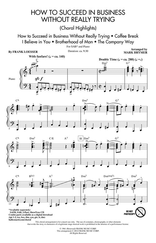It's the Broadway musical comedy hit revival! You'll delight in the music that recounts J. Pierrepont Finch's riotous rise up the corporate ladder as he struggles to juggle the promotion, the corner office and - of course - the girl. This 9-minute medley includes: Brotherhood of Man, Coffee Break, The Company Way, How to Succeed in Business Without Really Trying, I Believe in You. Available separately SATB, SAB, 2-Part and ShowTrax CD. Combo parts available as a digital download (tpt 1-2, tsx, bsx, tbn, syn, gtr, b, dm). Duration ca. 9:30