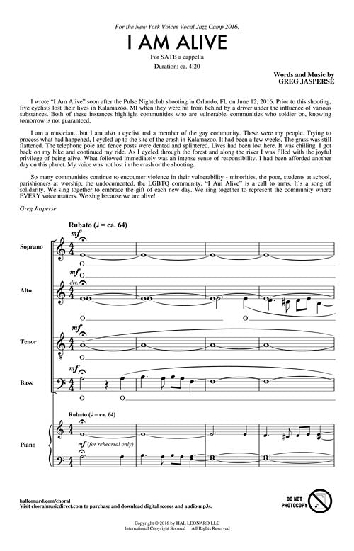 This is like one big jazz scat for the choir. Only syllables, no words. Written for the New York Voices Jazz camp, this song is HOT. And the only 3 words used embrace the joy of music making and the joyful affirmation of life I Am Alive.