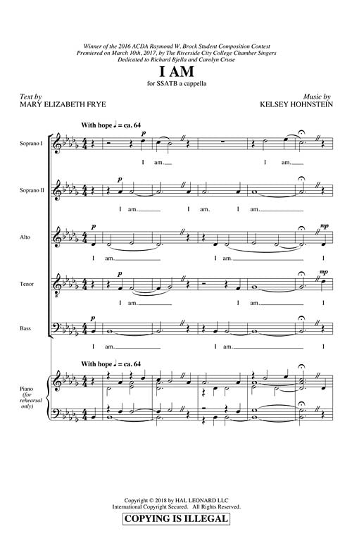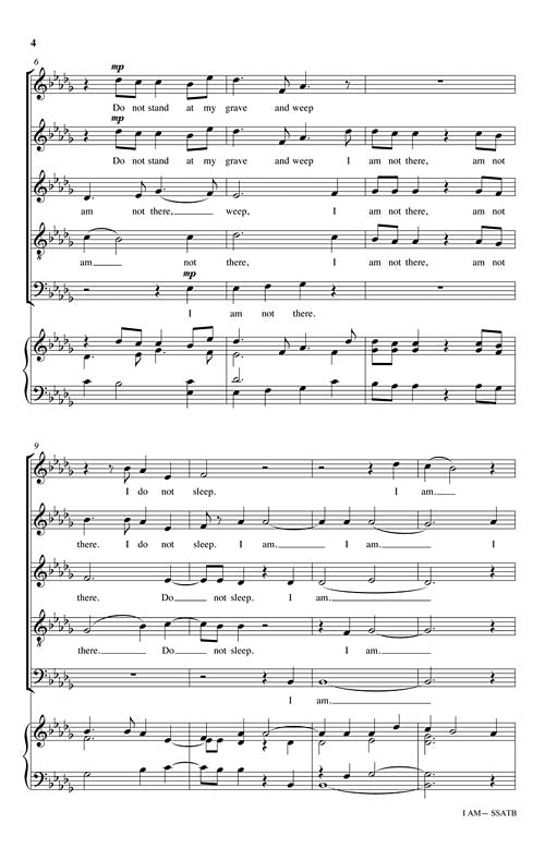 Winner of the 2016 ACDA Raymond W. Brock Student Composition Contest and premiered by the Riverside City College Chamber Singers, here is a lush setting of the iconic Mary Elizabeth Frye poem Do Not Stand at My Grave and Weep. Dedicated to American conductor Richard Bjella, this is a college and professional work that is worthy of any fine choir.