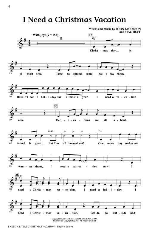 It's the last day of school before winter vacation officially starts. Excitement fills the air with plans of tropical vacations, shopping at the mall, visits from relatives, NO homework for a while!, favorite holiday meals and lots of presents! Everything is just right, including the beginning of a beautiful snowfall. SNOW!! Oh no! The snow keeps coming and vacation appears to be heading for disaster. Everyone may have to spend the holidays at school! Dinner cooked in the Science Lab? Shopping on the web? Perfect for all ages, this musical features 7 original songs arranged for piano and unison voices, clever dialog, choreography and a helpful production guide with staging tips, set ideas and costume suggestions. Performance Time: approx. 45 minutes. For grades 2-6. Songs include: I Need a Christmas Vacation, A Winter's Tale, Christmas Fiesta, Surfin' the Web, Santa Claus Be There for Me, Holiday House Party, Christmas With My Friends.