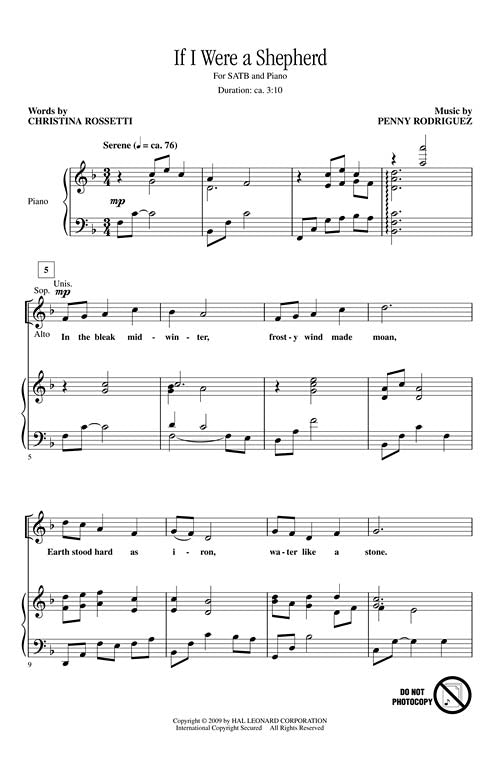 Christina Rossetti's perennial text is beautifully set to new music here by Penny Rodriguez. The choral parts are lovely, floating along on an exquisite piano accompaniment. Duration: ca. 3:10.