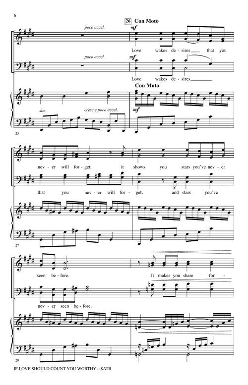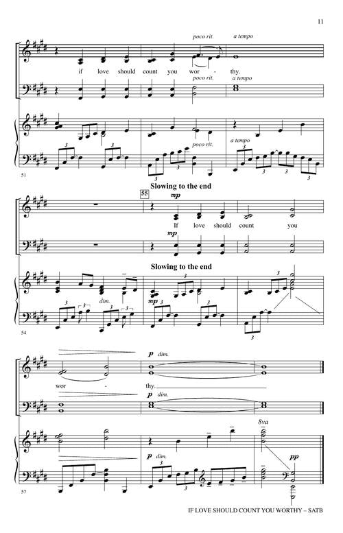 Lyric based on the poem by Sidney Royse Lysaght, speaks the blessings of when love enters our lives. Melodic writing rises and falls weaving with rich choral arranging, rests above a well-crafted and challenging piano accompaniment propelling this musical work.