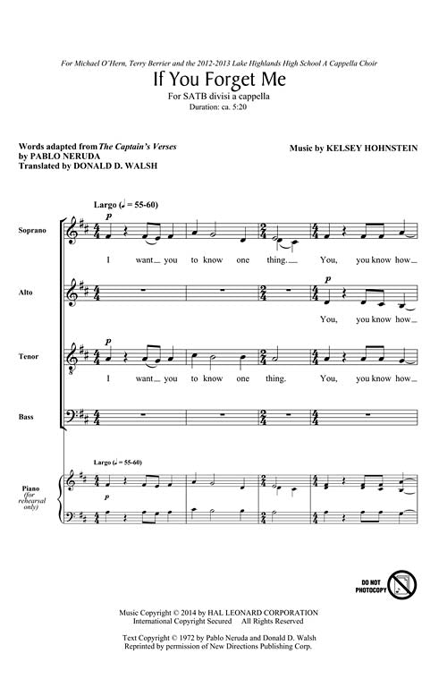 Taking its text from a poem by the great Chilean poet and diplomat Pablo Neruda, this rich setting for unaccompanied mixed voices is a reflection on love, on devotion to one's native land and ultimately to one's own identity. With strong unisons and striking harmonies, this impressive work will showcase better ensembles from high school and up. Duration: ca. 5:20