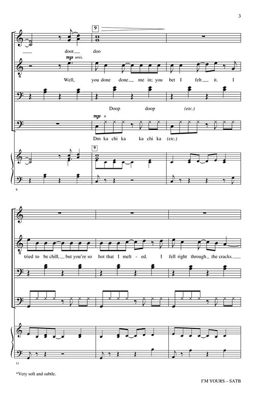 The King's Singers put their stamp on Jason Mraz' pop hit from 2008, with this solo-driven arrangement supported by a sweet harmonic back-up, all within a light reggae feel.