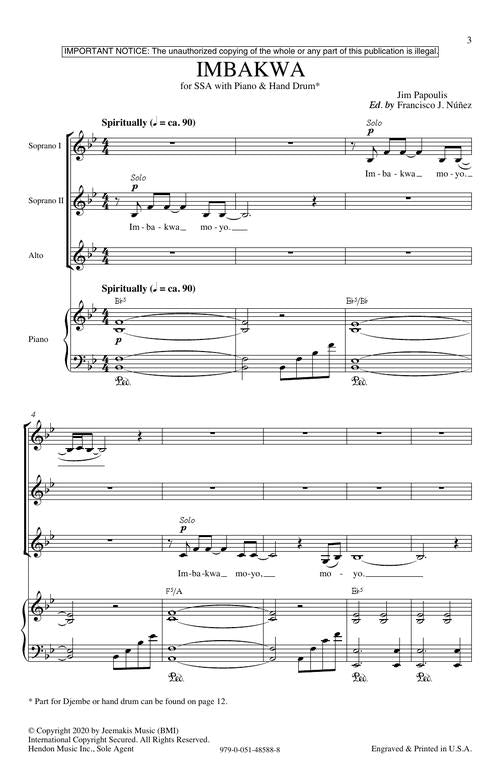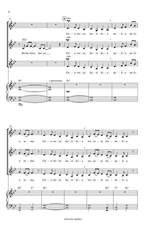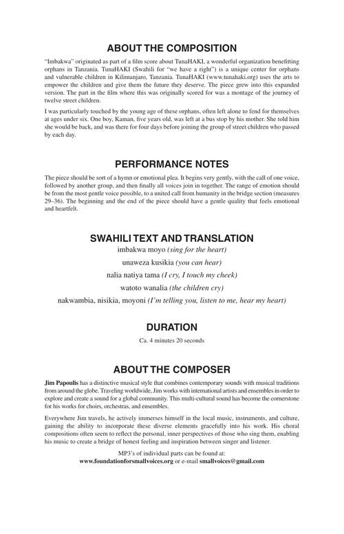 Composed in the World Music style with a text in Swahili, ft.Imbakwa ft. was written for a film score that features an organization benefiting orphans in Tanzania. This organization, called TunaHAKI, uses the arts to empower the children and give them the future they deserve. Hand drum part in vocal score.