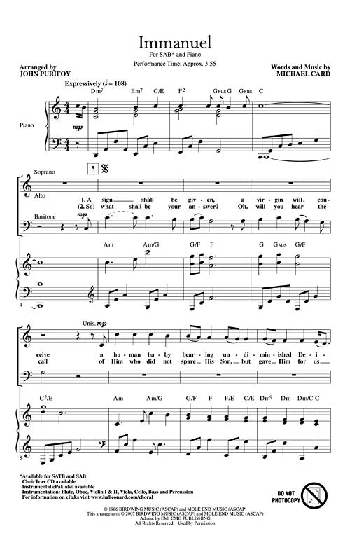 Michael Card's classic worship song Immanuel has been sensitively arranged for choir, creating a warm and worshipful anthem for the Advent or Christmas season. And if God is with us, who could stand against us? Our God is with us, Immanuel. Score and Parts (fl, ob, vn 1-2, va, vc, db, perc) available as a digital download.