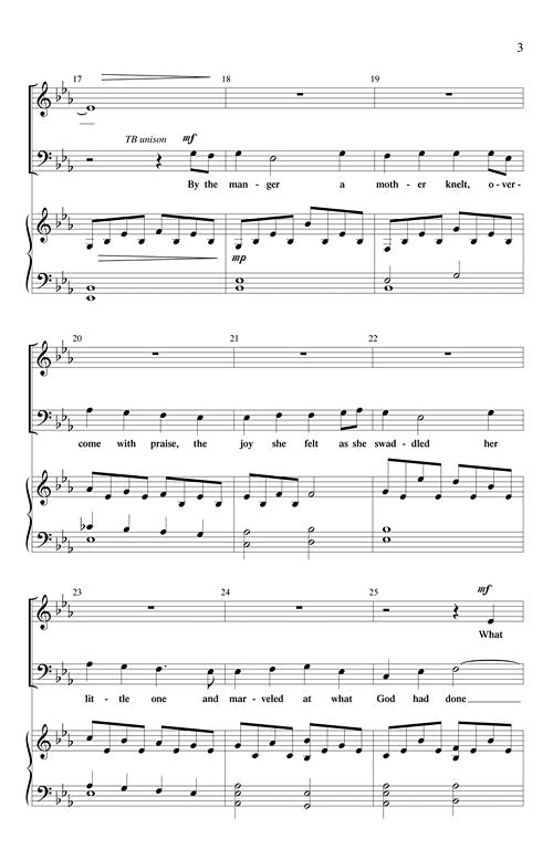 Composer Patricia Mock has teamed with arranger Richard Nichols to create a lovely Christmas anthem. The story begins gently and simply then crescendos steadily into a strong chorus of praise and thanksgiving. The melody line is tender and captivating, cleverly hooking back to the title phrase whether describing the scene or rejoicing in full. Easy to medium.
