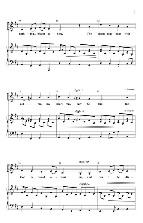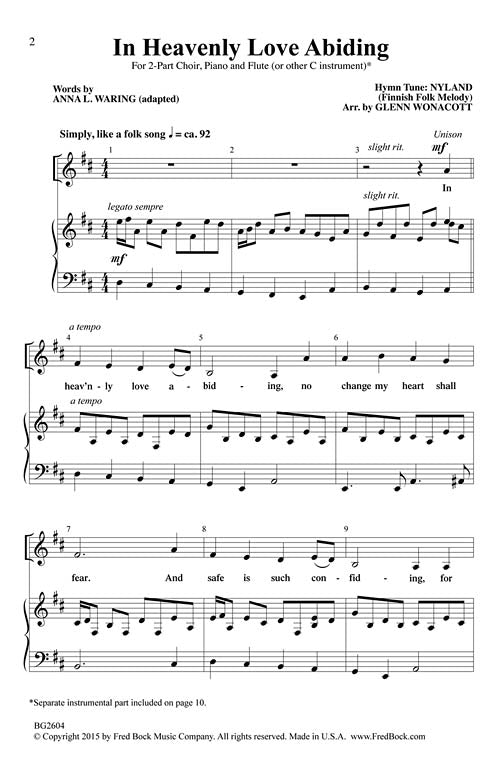 The Finnish folk melody's hymntune in this piece is called Nyland. It is a simple and gentle strain that Glenn Wonacott has decorated delightfully. The piano accompaniment has a Baroque feel to it as does the lovely obbligato part. Using a text by Anna Waring about God's reassuring presence at all times, the sentiment is reminiscent of Bach's Sheep May Safely Graze. Excellent as a children's anthem and also with any 2-Part voices in a worship service. Easy to medium.