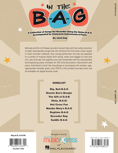 Motivate with B-A-G! Keep recorder interest high with this crafty collection of eight reproducible songs that will reinforce the first three notes taught in most recorder methods. Young performers will also be exposed to a variety of musical styles from swing, salsa and reggae to rock and roll, Latin and rap. Put together your own ensemble with the reproducible accompanying parts included for Orff and percussion instruments and piano. And there's more! DIGITAL ACCESS is included with hip recordings to accompany the simpler, age-appropriate recorder parts, plus PDFs of the printed recorder parts for overhead projection. Available: Book/Media Online. Suggested for grades 4-6. The price of this book includes a unique code that provides access to audio tracks online, for download or streaming. The tracks include PLAYBACK+, a multi-functional audio player that allows you to slow down audio without changing pitch, and loop points, change keys, and pan left or right - available exclusively from Hal Leonard.