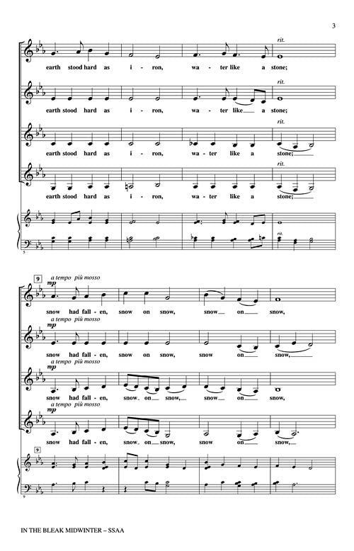 This gentle, jazz-flavored arrangement of the treasured Gustav Holst/Christina Rossetti carol will be absolutely stunning in performance! Lush choral textures and rich harmonies unfold one after the other for a magical concert moment! Duration: ca. 3:00. Available separately: SATB a cappella, SSAA a cappella.