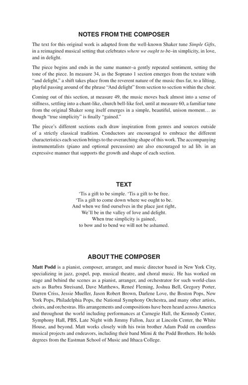 This original setting of the familiar text we know as Simple Gifts uses mixed meter and a colorful harmonic palette to highlight and explore the depth of Joseph Brackett's beloved poetry. This powerful new composition brings an exciting and accessible musical vocabulary to the words that inspired it, using a wide range of character and emotion. There are optional percussion instruments you can add for an even more artistic experience. Absolutely beautiful!