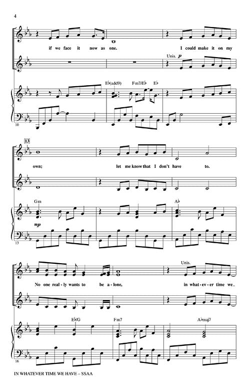 Exquisite lyrics and flowing vocal lines combine in this Stephen Schwartz ballad taken from one of his most performed musicals, Children of Eden. There are times I've been afraid ... Then I feel your hand in mine And there's courage in my heart.Available separately: SATB, SSAA, TTBB and ShowTrax CD. Performance Time: Approx. 3:15.
