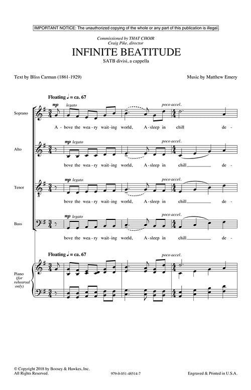 This beautiful text by Canadian poet Bliss Carman speaks to themes of peace, thankfulness and humility. The texture is mostly homophonic with brief sections of divisi to illuminate colors and images in the text. There are short passages for SSA and TBB that add interest in color and texture and also offer opportunity to feature sections.