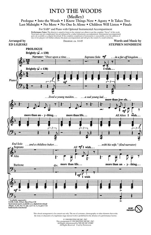 When a baker and his wife learn they've been cursed by the witch next door, they embark on a quest for the special objects required to break the spell in a hysterical take on the Brothers Grimm! Sondheim's inventive songs are masterfully set for choral ensembles of all ages in this 15-minute choral medley. Songs include: Into the Woods, I Know Things Now, Agony, It Takes Two, Last Midnight, No More, No One Is Alone, Children Will Listen, Finale. Available separately: SATB, SAB, 2-Part, ShowTrax CD. Instrument Parts available as a digital download (flt/pic, cl, bn, hn 1-2, tpt, syn 1-2, vc, b, perc 1-2). Duration: ca. 14:45.