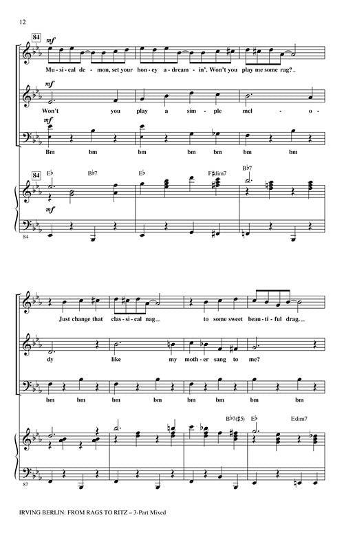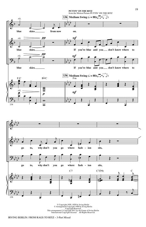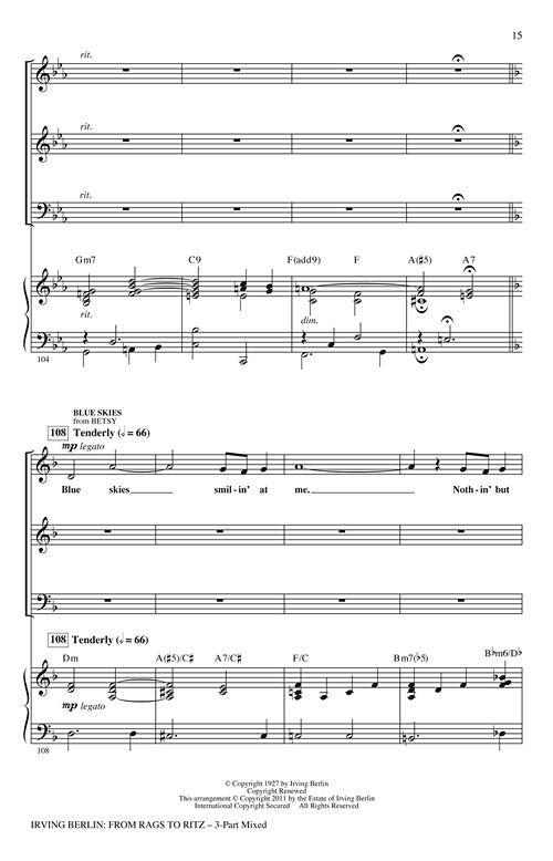 Celebrate the 100th anniversary of Irving Berlin's classic Alexander's Ragtime Band with this medley of four of his all-time greatest hits arranged for choir, band and strings! A fantastic closer or festival feature, it includes: Alexander's Ragtime Band, Blue Skies, Play a Simple Melody, Puttin' on the Ritz. Available separately: SATB, 3-Part Mixed, 2-Part, ShowTrax CD, Concert Band (Grade 3), String Pak. Duration: ca. 4:35.