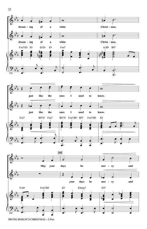 This spectacular setting for choir, band and optional strings of some of Irving Berlin's classic songs offers a variety of entertaining performance options and highlights his most beloved holiday songs. The 7-minute medley includes: Happy Holiday, I've Got My Love to Keep Me Warm, Count Your Blessings Instead of Sheep, Snow, White Christmas. Available separately: SATB, SAB, 2-Part, Concert Band (Grade 3), String Pak, ShowTrax CD. Duration: ca. 6:40.