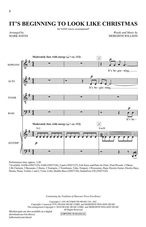Meredith Willson's famous song is wonderfully arranged for choirs by Mark Hayes and has a terrific piano accompaniment, as well as optional orchestral parts. The introduction is captivating and paints the magic of the holidays while the heart of the song ends with a big and broad finish. A choral classic for all ages!