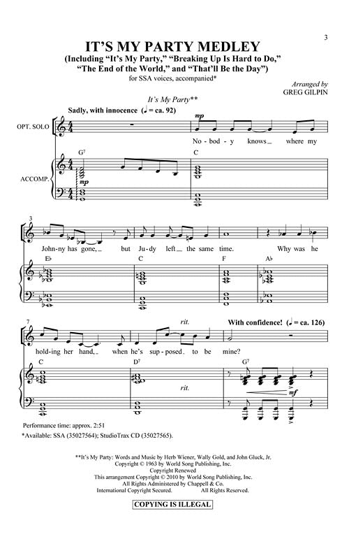 Greg Gilpin has taken the pop hit songs It's My Party, Breaking Up Is Hard to Do, The End of the World, and That'll Be the Day and created a smart, story-telling medley of crushed hearts and broken romance. Even though they start out crying, these girls decide to refuse the tears and stand strong by the end of this fun SSA work for the ladies. Available separately: SSA, StudioTrax CD. Duration: ca. 2:51. G