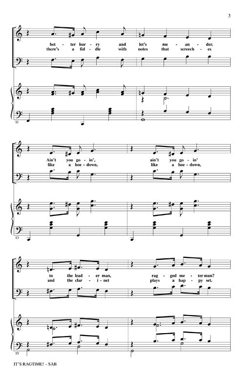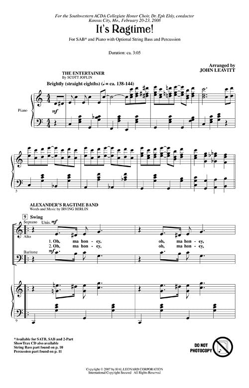 Enjoy a little ragtime razzmatazz with this creative pairing of Scott Joplin's The Entertainer and Irving Berlin's Alexander's Ragtime Band. A great concert showcase for choirs of all ages! Available separately: SATB, SAB, 2-Part, ShowTrax CD. Duration: ca. 3:05.