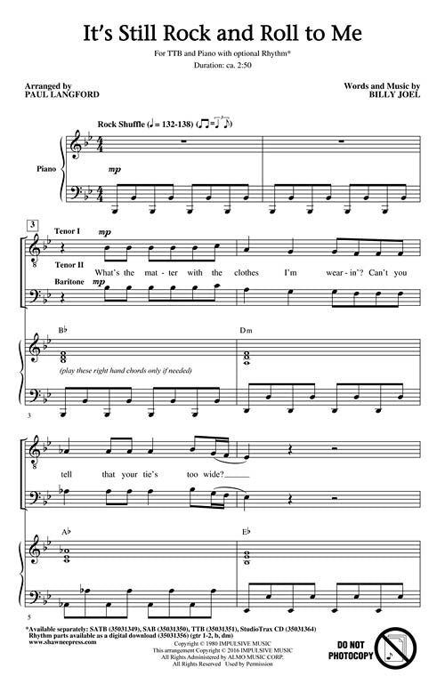 This was a 1980 hit for Billy Joel and written as a cynical look at the new music trends that were happening at the time. Considered a rock and roll classic, this arrangement keeps true to the original and will be a powerhouse performance by men's as well as mixed choirs.