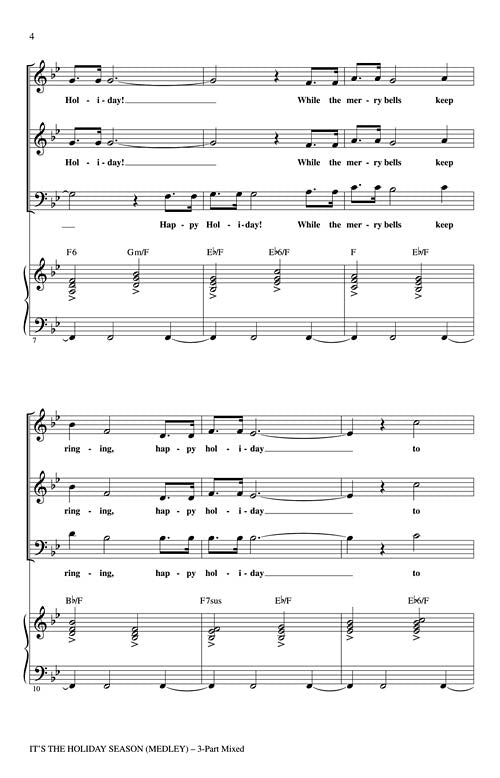This 4-minute medley of popular holiday songs is a sparkling selection for a concert finale or community events and may be performed with choir alone or combined with a concert band and optional string orchestra. Includes: Happy Holiday, The Holiday Season, Let It Snow! Let It Snow! Let It Snow! Duration: ca. 4:00. Available separately: SATB, 3-Part Mixed, 2-Part, VoiceTrax CD, Band Accompaniment (Grade 2), String Pak.