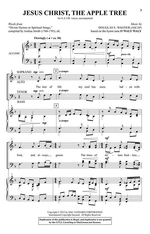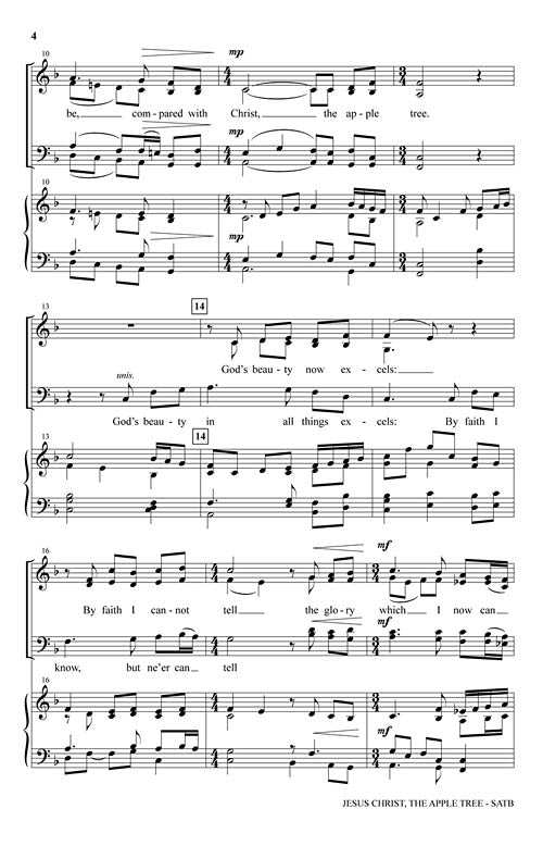 Uses: General Scripture: John 15:1-5 Ancient words joined with a beloved folk song bring us a highly poetic vision of the nurturing ministry of Jesus. Using the image of an apple tree, the lesson of this song is to discover in Christ our soul source for spiritual health. Richly harmonized, this popular tune is right at home with this artful text. The internal vocal lines receive special consideration in the arrangement creating a satisfying richness to the overall tone. Duration: ca. 2:32.