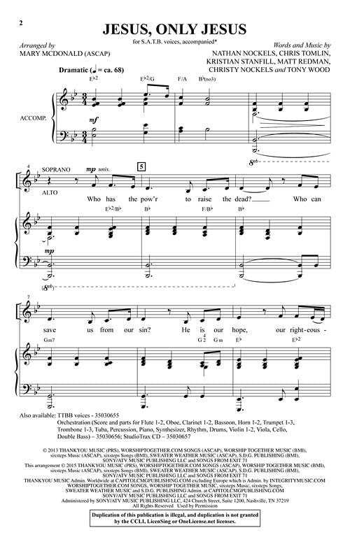 Dramatic and effective, this contemporary ballad from Passion and Matt Redman calls us to worship and adoration. The title says it all on this Christ-centered choral filled with inspiring moments of poetry and praise. Gradually building from the restrained opening, the piece proceeds in a mighty crescendo of affirmation. Score and Parts (fl 1-2, ob, cl 1-2, bn, hn 1-2, tpt 1-3, tbn 1-2, tbn 3/tba, perc, pno, syn, rhythm, dm, vn 1-2, va, vc, db) available on CD-ROM and as a digital download.