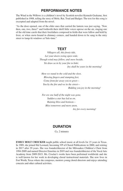 With lyrics excerpted and adapted from the classic Scottish novel Wind in the Willows, here is a wonderful winter concert piece that is upbeat and energetic.