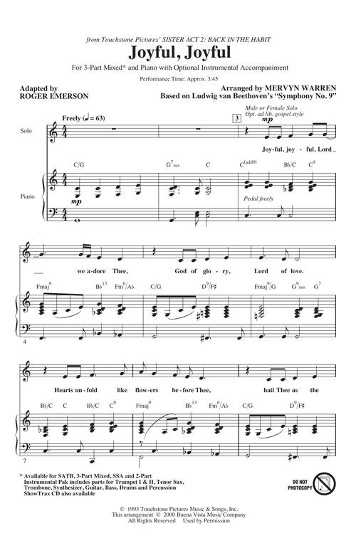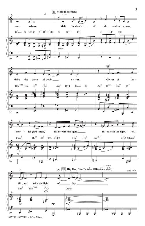Sister Act 2 brings us an energetic gospel treatment of the immortal Ode to Joy melody in an accessible, authentic-sounding arrangement. Now available in a 3-Part Mixed voicing, this raise-the-roof showstopper is electrifying! Available: SATB, SSA, 2-Part, 3-Part Mixed, Instrumental Pak, ShowTrax CD. Performance Time: Approx. 3:45.