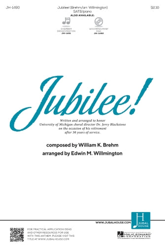 Written and arranged to honor the retirement of University of Michigan choral director Dr. Jerry Blackstone, Jubilee! will delight both singers and audiences alike. Composer William K. Brehm and arranger Edwin M. Willmington infuse this piece with dynamic rhythms and fluid melodies to express gratitude and rejoicing for Dr. Blackstone's 30 years of impact on students and choral directors all over the world.