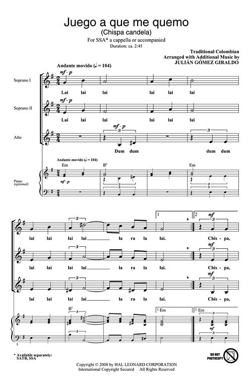 Based on a Colombian folksong, this irresistible setting is full of rhythm and playful humor! A spark, a flame, let's see if I get burned. A spark, a flame, I am burned already. In Spanish, with notes and English translation. Perform it a cappella or add piano, guitar, bass or percussion ad lib. Available separately: SATB, SSA. Duration: ca. 2:45.