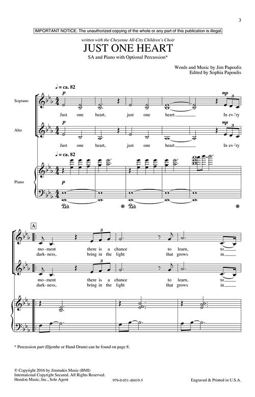 Drawing from a simple idea, that reaching even just one heart can be a very powerful gesture, here is the positive message in music that we have come to expect in the music of Jim Papoulis. World rhythms, optional percussion and positive lyrics make this a great selection for young people.