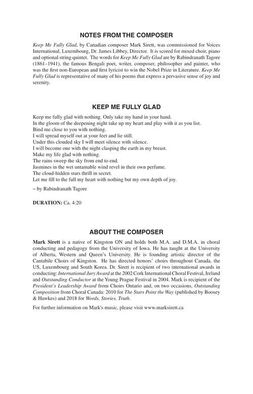 With a joyful and serene text by Bengali poet, writer, composer, philosopher and painter Rabrindranath Tagore, here is a skillfully crafted song for mixed choir and piano with an optional string quintet.
