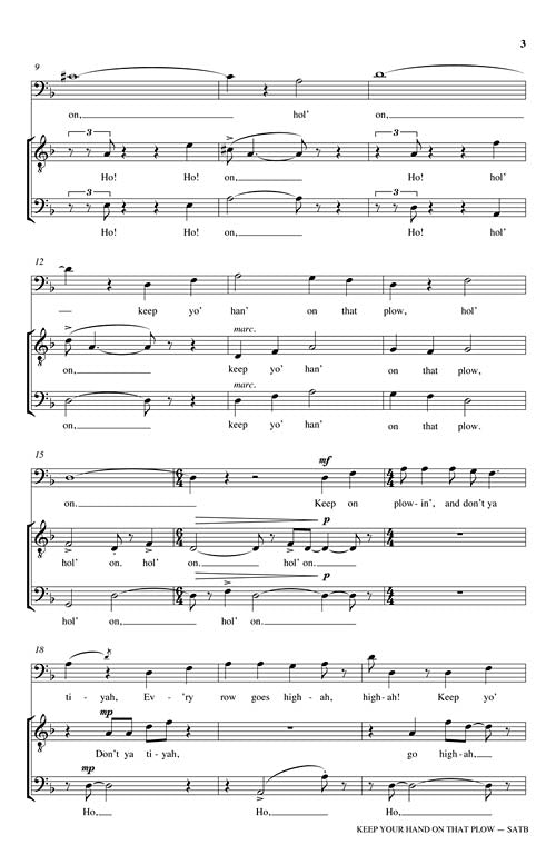 This traditional spiritual comes out of the work song tradition. It is firm and strong and features a baritone soloist who instructs the singers to keep their hands on the plow. The call and response between soloist and choir is classic and offers a wonderful opportunity to teach this style so important in our history.