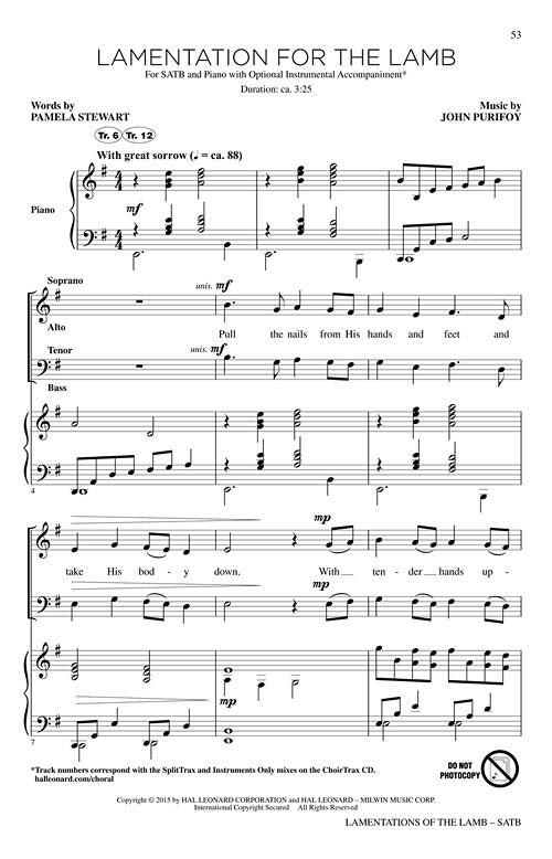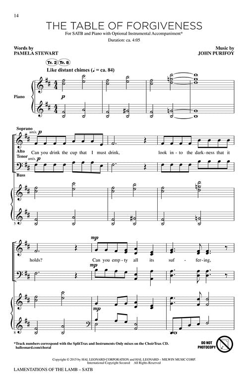 The writing team of John Purifoy and Pamela Stewart have crafted a brief work for Maundy Thursday or Good Friday, suitable for use as a Tenebrae service. Told from the historical perspective of the Gospels, as well as from the Old Testament laments that foreshadow them, Lamentations of the Lamb takes us on a journey through the final days in the life of Christ. Each anthem itself is a plaintive lament taken from these combined narratives. With a final stirring lamentation offered by creation, here is a powerful ending to Holy Week in preparation for Easter. Songs include: A Gathering of Shadows; The Table of Forgiveness; Forsaken in the Garden; In the Twilight of My Sorrow; Come, Ye Disconsolate; Lamentation for the Lamb. Score and parts (fl, ob, vc) available on CD-ROM.