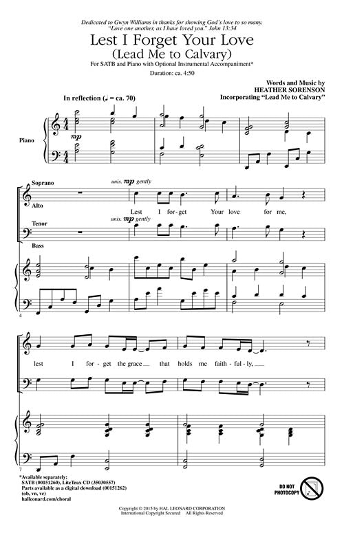 Mingling the new with the old this meaningful paean of grace is ideal for blended worship situations, and Heather Sorenson's latest offering creates a reflection upon the journey to repentance and an invitation to recollect the profound gift of mercy as displayed at the cross. Satisfying harmonies support a lovely melody, while the contemporary approach to the piano accompaniment provides support and color. Special! Instrumental Parts (ob, vn, vc) available as a digital download.