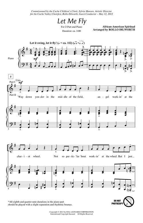 In the traditional spiritual Let Me Fly, the chariot is presented as a symbol of freedom. This creative setting for 2-Part treble choirs offers lots of opportunities for musical growth and expression with its steady marching accompaniment, interesting harmonies, strophic variation and well-crafted and accessible vocals.