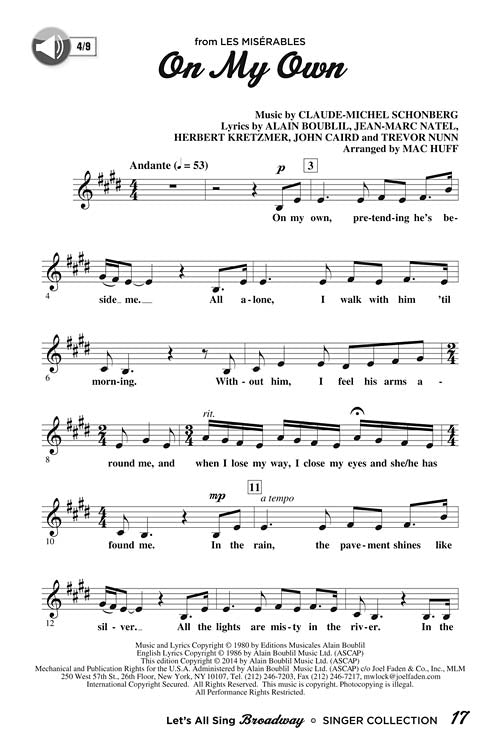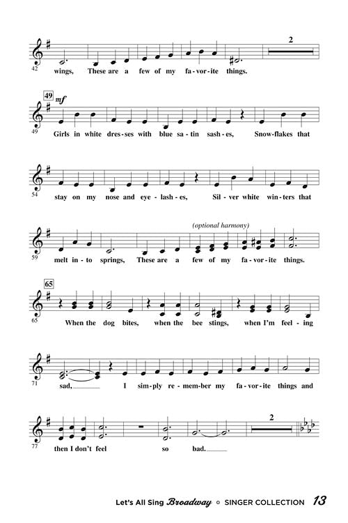 Celebrate musical theatre with hits from Joseph and the Amazing Technicolor Dreamcoat, Wicked, The Sound of Music, Les Misérables and Rent. It's the sound of Broadway! This unique musical collection of Broadway hits is perfect for group singing in the classroom, choir or community. These songs have been carefully arranged for young unison voices with some optional harmony. The Piano/Vocal Collection offers the fully accompanied song, and the Singer Edition comes in handy paks of ten and provides vocal parts only. Songs include: Any Dream Will Do, For Good, My Favorite Things, On My Own, Seasons of Love.