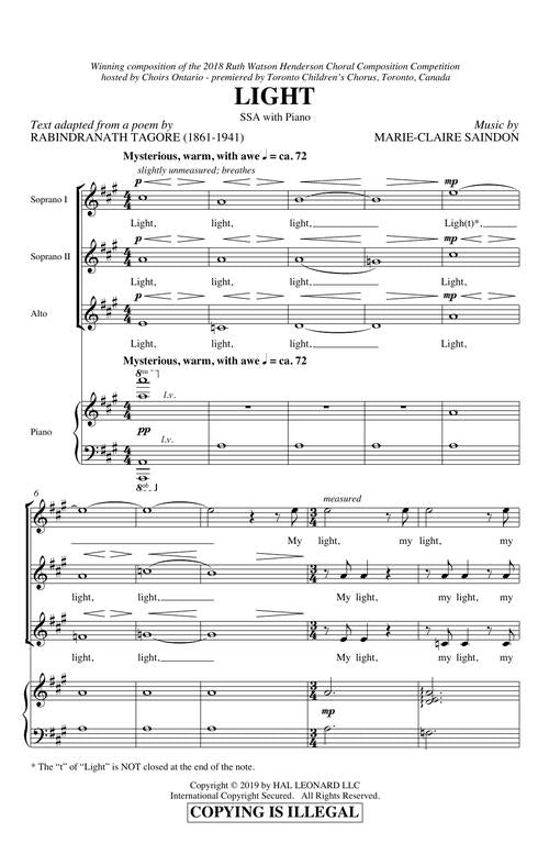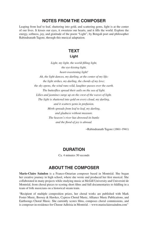 Leaping from leaf to leaf, shattering into gold, and scattering gems, light is at the center of our lives. It kisses our eyes, it sweetens our hearts, and it fills the world. This music explores the energy, softness, joy, and gratitude of the poem Light by Bengali poet and philosopher Rabindranath Tagore.