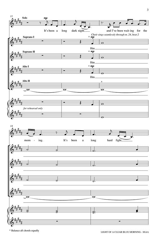 Now adapted for SSAA by Richard Gabrillo, Craig Hella Johnson's setting of Dolly Parton's Light of a Clear Blue Morning is infused with light and hopefulness as it opens with a solo soprano and gradually builds to a joyful overflowing of sound and vocal texture, then gently relaxing into a reflective conclusion. With soprano recorder.